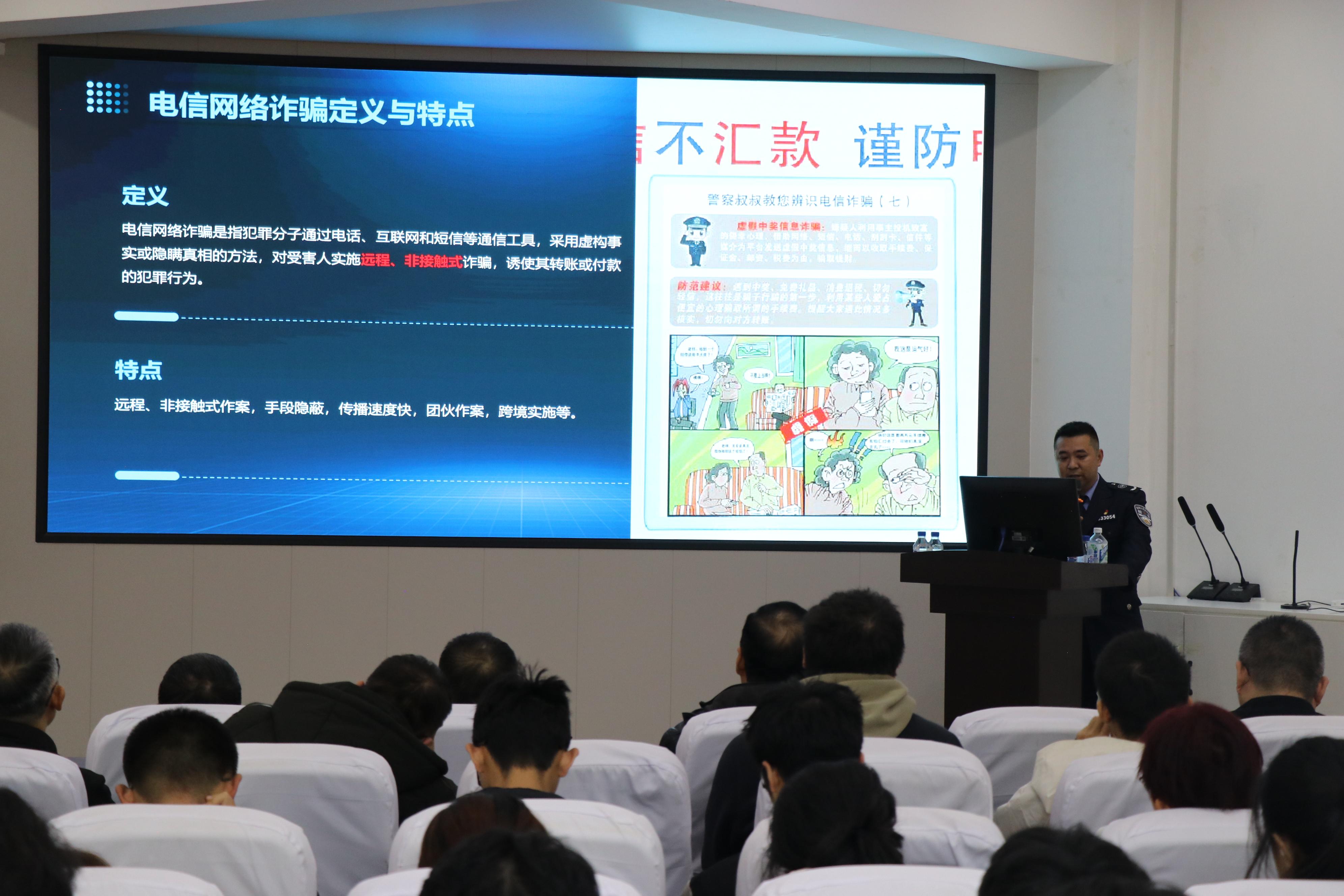 东区保卫办公室田刚老师从基本概念和多样实际案例入手,向师生们介绍了当前常见的网络电信诈骗类型,揭示了电信诈骗所带来的严重危害,列举了“杀猪盘”“网络投资”等典型电诈手法,并讲解了识别电信诈骗的方式与求助渠道。