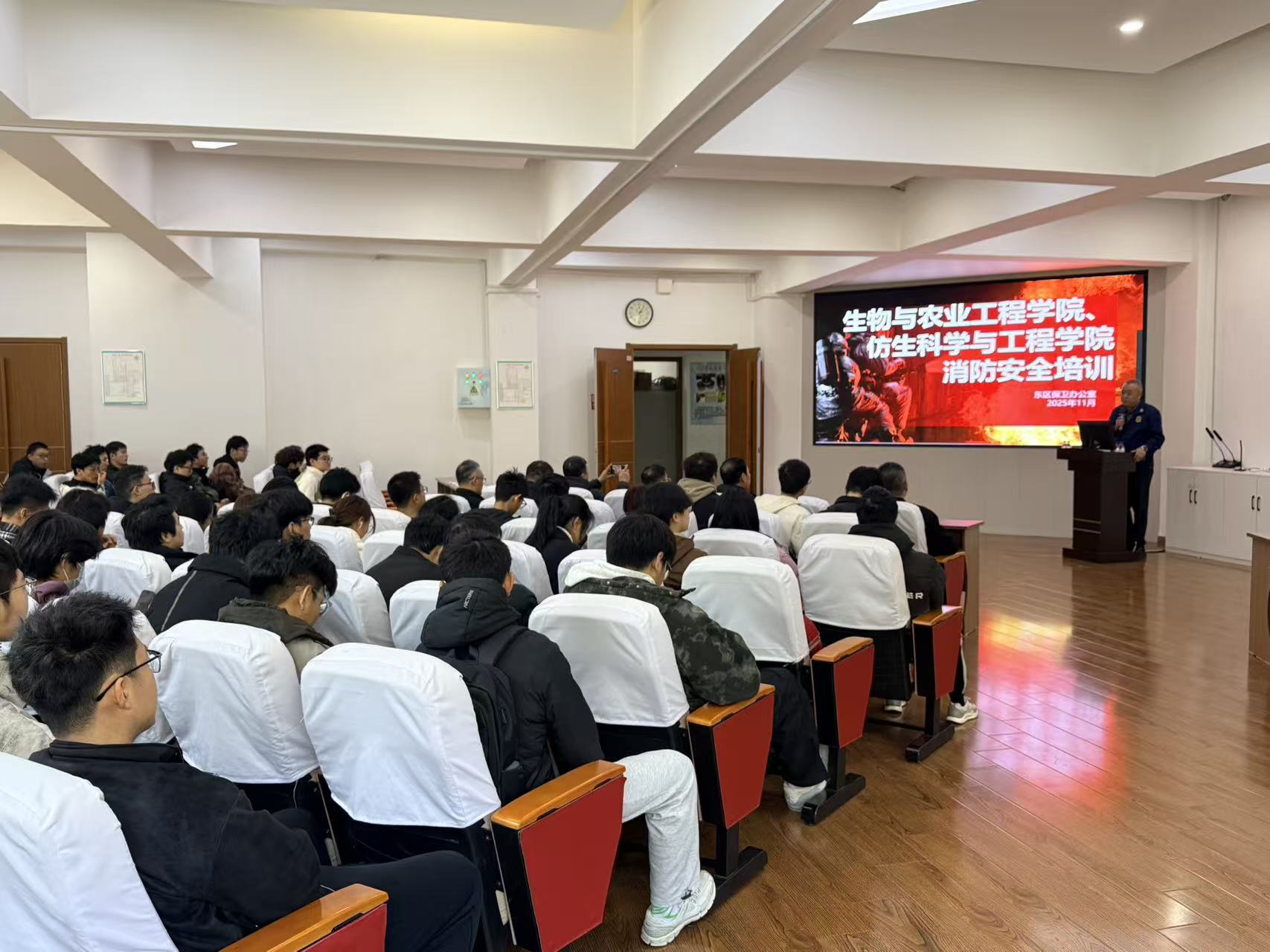 学校保卫处东区保卫办公室消防科科长王中刚主讲消防安全培训。通过播放近期火灾事故视频,提示校园消防隐患重点,提醒师生时刻注意用火、用电安全;详细讲解火场逃生方法,让大家掌握自救技能。