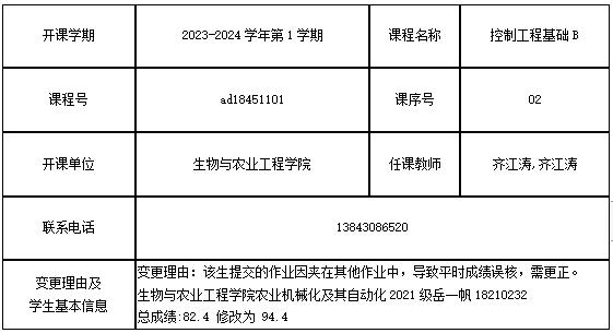 关于生物与农业工程学院2021级岳一帆同学控制工程基础B课程成绩更正的公示