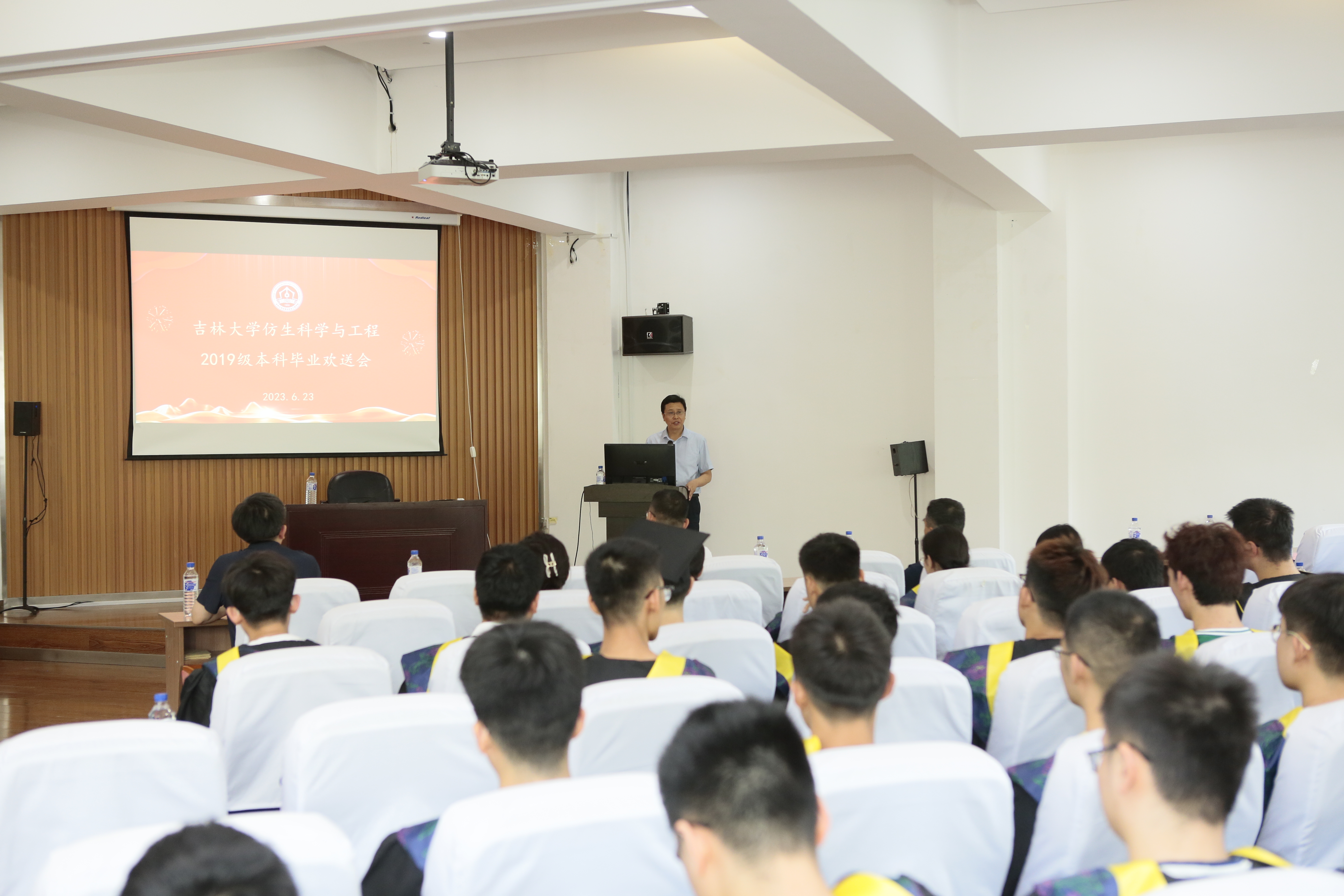 2023年6月23日下午14:00,生物与农业工程学院“仿生科学与工程”新工科专业2019级本科生毕业欢送会在仿生楼209会议室隆重举行。生物与农业工程学院、仿生科学与工程学院院长付君教授,工程仿生教育部重点实验室主任韩志武教授,学院副院长张志辉教授、郭鸿鹏教授,仿生科学与工程系主任邹猛教授、副主任任丽丽教授,2019仿生新工科班班主任刘镇宁教授、孙航教授、庄健研究员,以及全体2019级本科毕业生参加了本次欢送会,欢送会由学院副院长张志辉教授主持。
