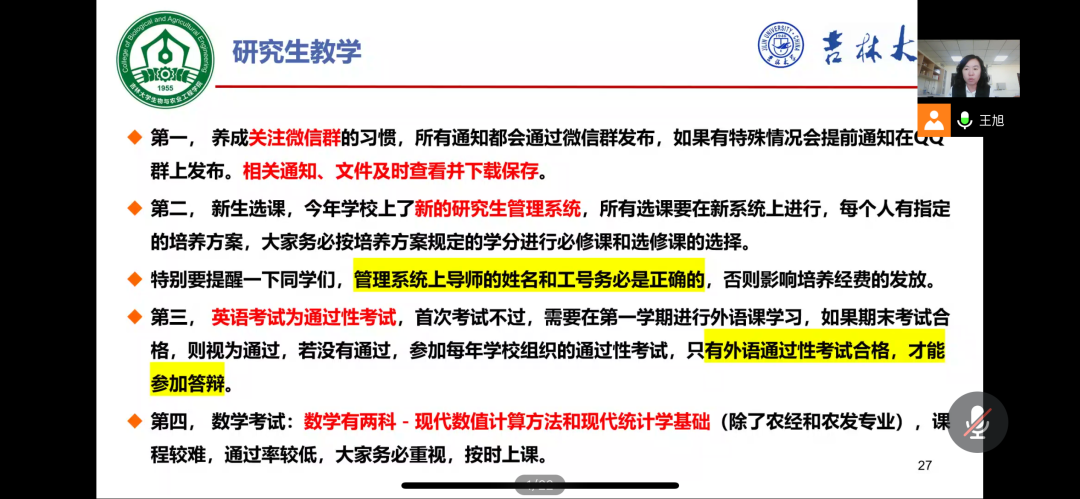 9月1日,生物与农业工程学院2022级研究生新生入学教育讲座于线上成功举办。出席讲座的有主管研究生工作副院长张志辉老师、研究生管理办公室柏杨老师和研究生辅导员王旭老师,讲座由王旭老师主持,200余名研究生新生同步在线参加。9月1日,生物与农业工程学院2022级研究生新生入学教育讲座于线上成功举办。出席讲座的有主管研究生工作副院长张志辉老师、研究生管理办公室柏杨老师和研究生辅导员王旭老师,讲座由王旭老师主持,200余名研究生新生同步在线参加。