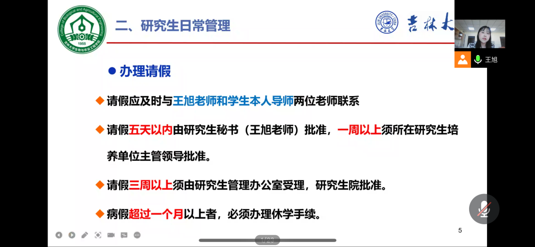 随后,王旭老师介绍了研究生思政方面的入学教育。主要包括常用信息(办公地点、联系方式及常用网址)、研究生日常管理(办理请假、离校返校请假说明、住宿变更、研究生医疗保险、其他事务办理)、研究生奖、助、贷、补(荣誉称号、纪律处分、奖学金评优、助学贷款、经济关注对象、困难补助)、研究生党员发展、重要提示、近期工作以及主要学生工作七个方面,内容详尽。