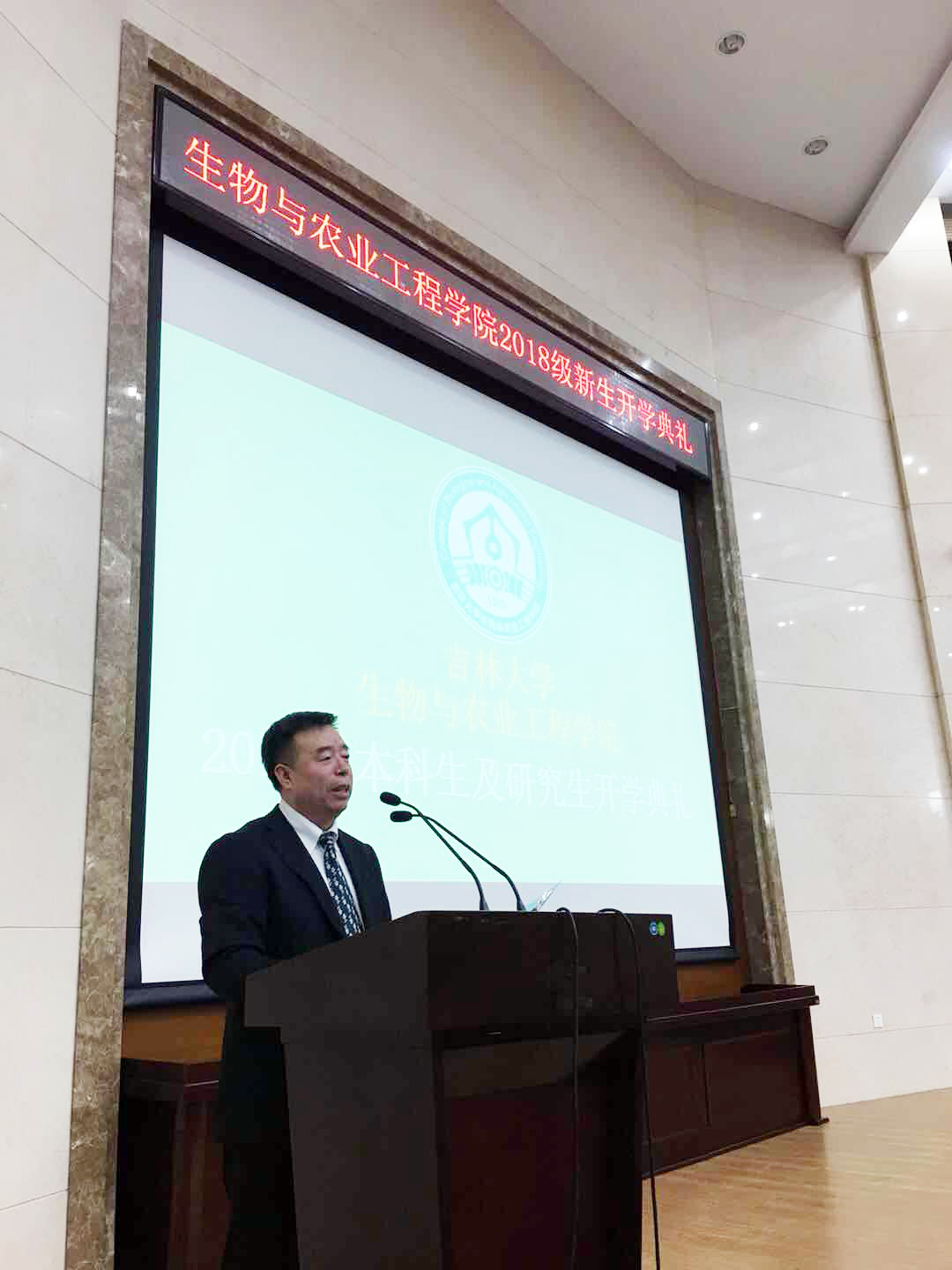 新的学期,开启新的希望;新的希望,承载新的梦想。为了对刚刚由和平校区回家的新同学们表示热烈欢迎,使新同学尽早熟悉学院环境,及早做好大学生涯规划,立鸿鹄志,扬帆远航,生物与农业工程学院于10月13日下午在仿生楼报告厅举行了2018级新生开学典礼。院长于海业、党委书记杨宝泉,学院、工程仿生教育部重点实验室班子成员,系主任、党支部书记,教师代表、机关工作人员出席了开学典礼。典礼由院党委副书记兼副院长吕游主持。