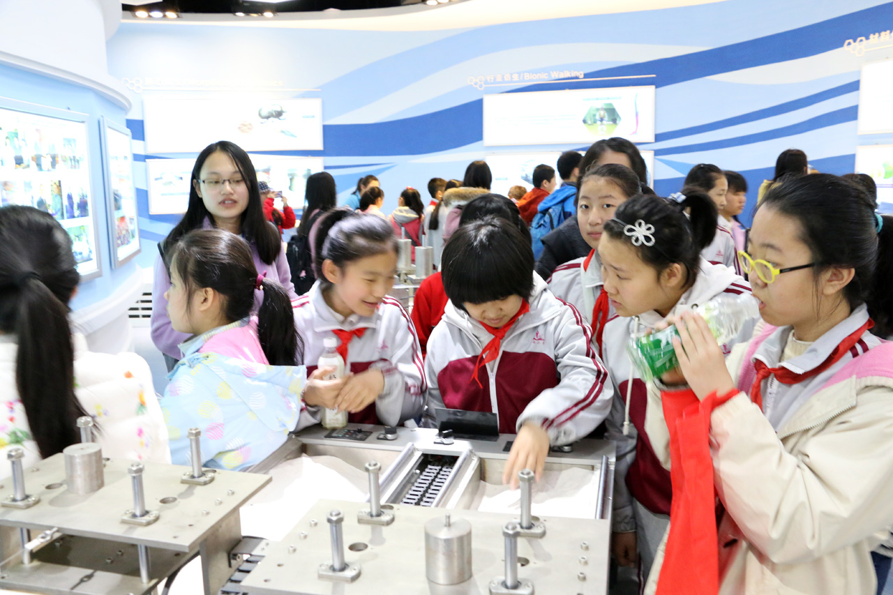 随后小朋友们在志愿者们的带领下进入仿生楼参观。每一位志愿者带领两个小朋友参观,负责他们的安全并为他们做讲解。小同学们参观了一些仿生科学的应用,并观看了仿生知识的的宣传片。
