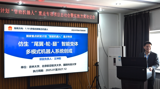 2025年4月24日,由我校牵头承担的两项国家重点研发计划“智能机器人”重点专项项目“仿生拉压体人形机器人设计制造理论与关键技术”和“仿生‘尾翼-轮-腿’智能变体多模式机器人系统创成”项目启动会在长春召开。工信部产业发展促进中心项目主管范玫杉,中国科学院沈阳自动化研究所刘连庆研究员、中兵智能创新研究院有限公司江磊研究员、南京航空航天大学李迎光教授、山东大学李贻斌教授、中国科学院自动化研究所侯增广研究员和哈尔滨工程大学秦洪德教授6位项目专家出席会议。我校科研院综合办公室主任孙铁民,beat365在线体育官网副院长于征磊,工程仿生教育部重点实验室副主任钱志辉以及项目组成员参加了会议。