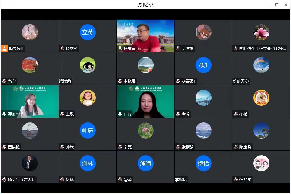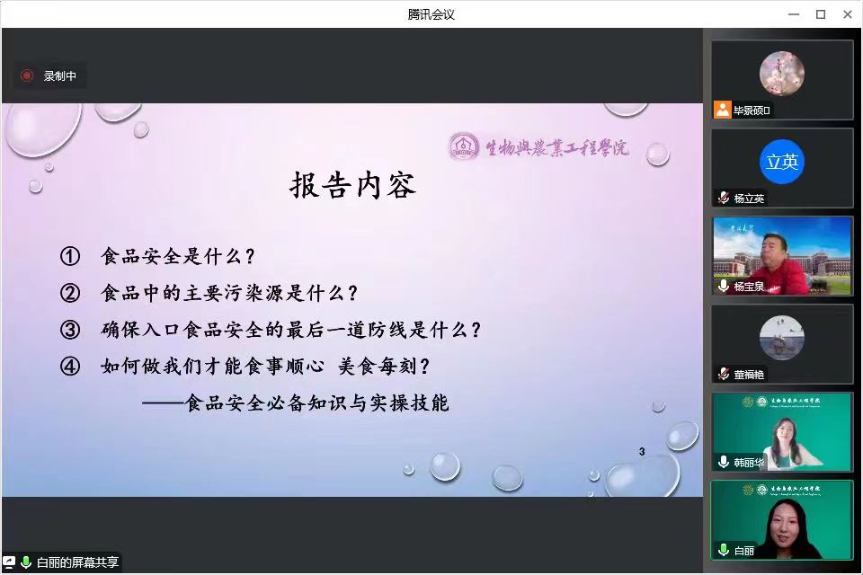 为以巾帼之心向党的二十大献礼,号召学院女性职工关注食品安全,乐享健康幸福的家庭生活,2022年12月7日下午1时30分,由生物与农业工程学院、仿生科学与工程学院妇委会举办的“妇女小家,一家一品”创新活动之“食事顺心,美食每刻”主题讲座于线上举行。学院党委书记杨宝泉、原党委书记兼院长杨印生、全体女性职工及部分男老师和外校外地的老师们参与此次分享会。