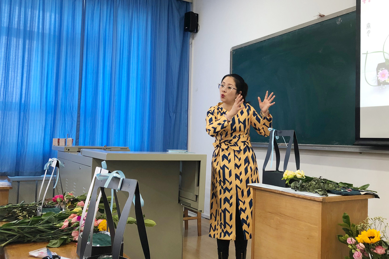 然后,特邀嘉宾,吉林省经济管理干部学院园林专业教师、高级花卉园艺师、中国插花花艺协会会员、长春市现代女性大讲堂高校巡讲团特聘讲师刘春博老师,为大家讲授了插花的艺术及插花技巧,并现场进行实物操作指导。