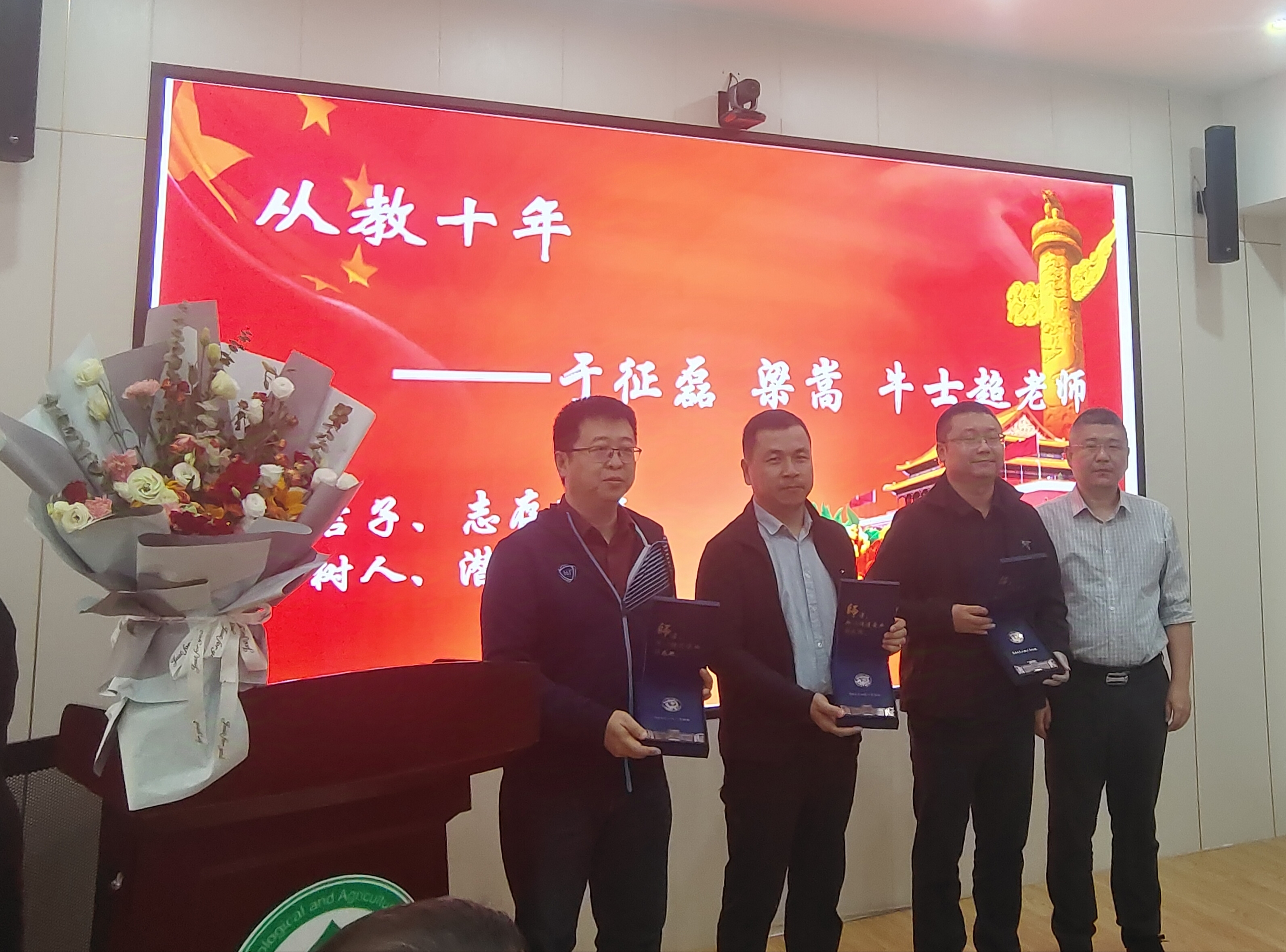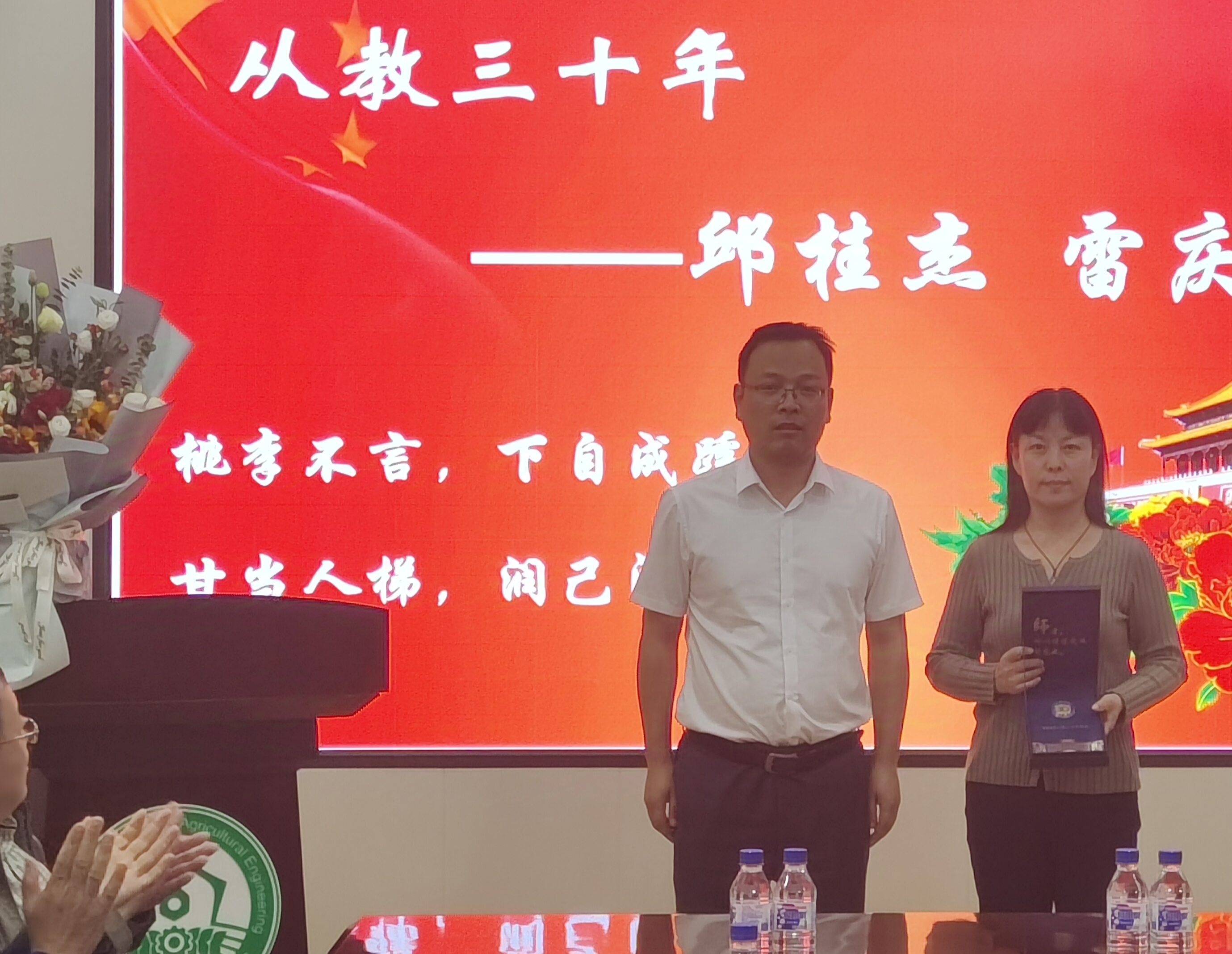 杨宝泉书记为与会教师代表解读学校从教荣誉勋章的深刻寓意,宣读获得学校从教荣誉勋章获得者名单,钱锋副院长、郭鸿鹏副院长分别为获得从教10年及20年的教师颁奖,付君院长、杨宝泉书记分别为从教30年及40年的教师颁奖。付君院长为新入职的四名教师颁授新入职荣誉勋章。