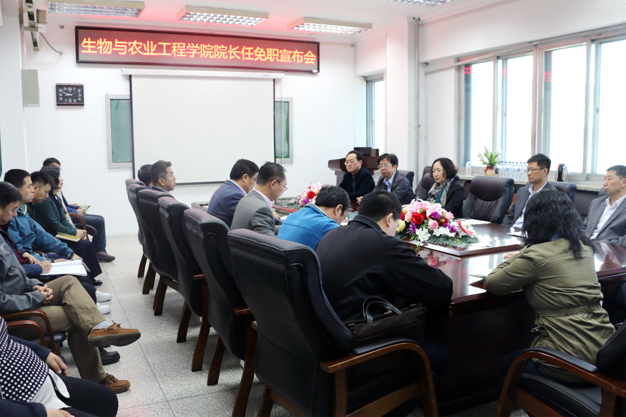 2017年5月8日上午8点30分,生物与农业工程学院在农机交通馆四楼会议室召开了院长任免职宣布会。beat365在线体育官网常务副书记蔡莉教授、beat365在线体育官网党委组织部副部长曲思伟同志,学院领导班子成员、党委委员、纪委委员、监察员、学院教学委员会主席、工程仿生教育部重点实验室主任、副主任、各系主任、副主任、各教工党支部书记等参加了会议,会议由学院党委书记杨印生教授主持。