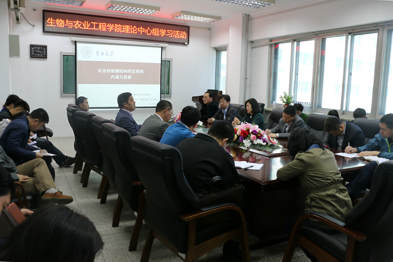 生物与农业工程学院于2017年5月8日上午在农机交通馆四楼会议室召开了学院理论中心组学习会,学院及工程仿生教育部重点实验室全体领导班子成员、各系主任、副主任、实验室主任、党支部书记、全体管理干部参加了会议。会议由党委书记杨印生教授主持。