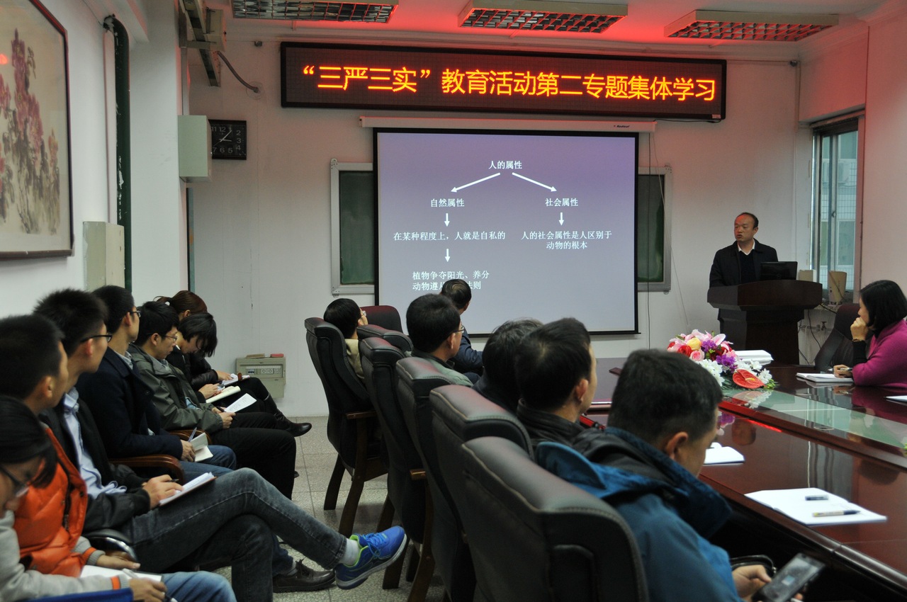 其次,学院行政副院长马研以《严于律己,守纪律,讲规矩》为题作了汇报。他引古博今,从严以修身、严以用权、严以律己三个方面系统阐述,最终导出了观点:严以律己应做到敬畏、宽容、慎独慎微、知行合一。之后,他通过对学科60年发展历程中重大历史时刻的简要回顾,结合学院院训,以“不忘初心,方得始终”自勉,鼓励党员领导干部、学生骨干为实现学科的伟大复兴,严于律己,不懈奋斗。