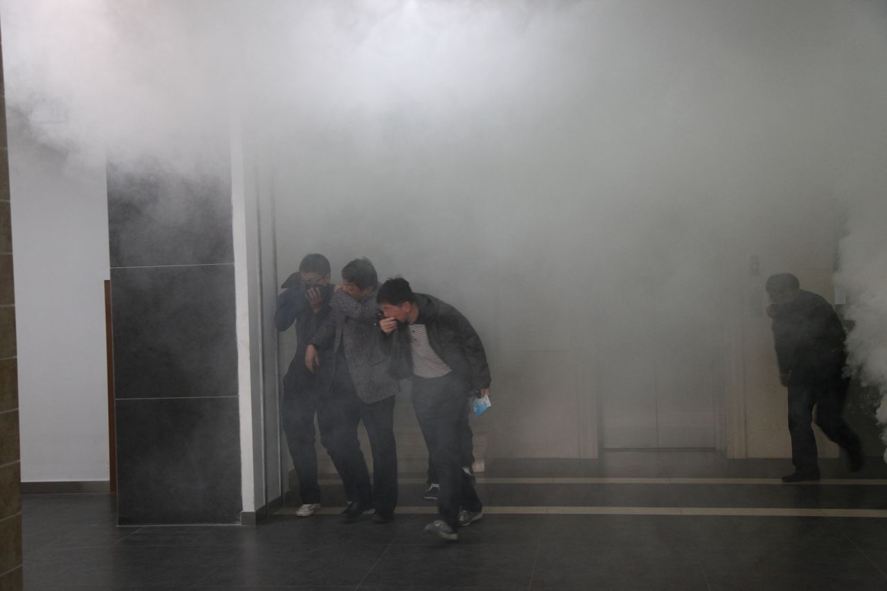 下午15:10时,随着急促的警报声和刺鼻的浓烟,楼内的全体老师及同学沿着疏散路线有序撤离到安全地带,疏散演练圆满结束。