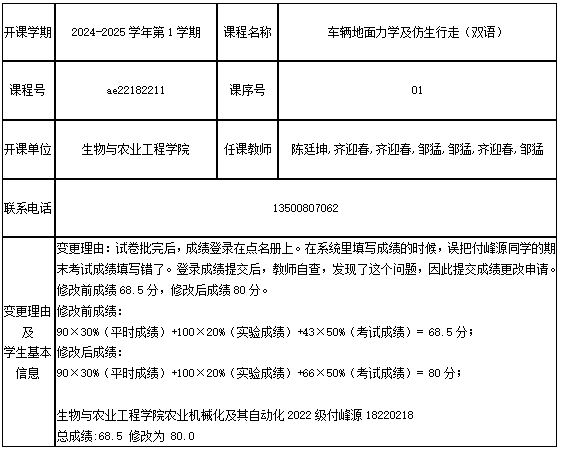 关于学院2022级付峰源同学车辆地面力学及仿生行走(双语)课程成绩更正的公示